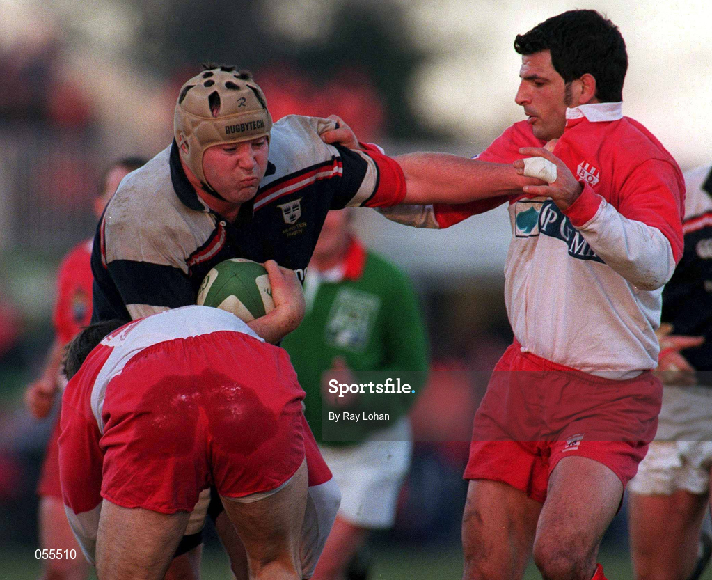 28 January 2001; Anthony Foley of Munster holds off the challenge of Bernard Daguerre, 22, and Marc Lievremont of Biarritz during the Heineken Cup Quarter-Final match between Munster and Biarritz at Thomond Park in Limerick. Photo by Ray Lohan/Sportsfile