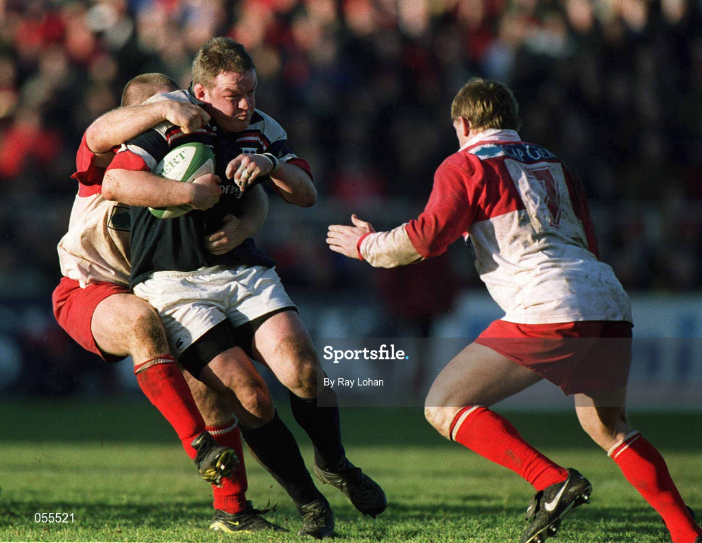 28 January 2001; Mick Galwey of Munster is tackled by Denis Avril, left, and Christophe Milheres of Biarritz during the Heineken Cup Quarter-Final match between Munster and Biarritz at Thomond Park in Limerick. Photo by Ray Lohan/Sportsfile