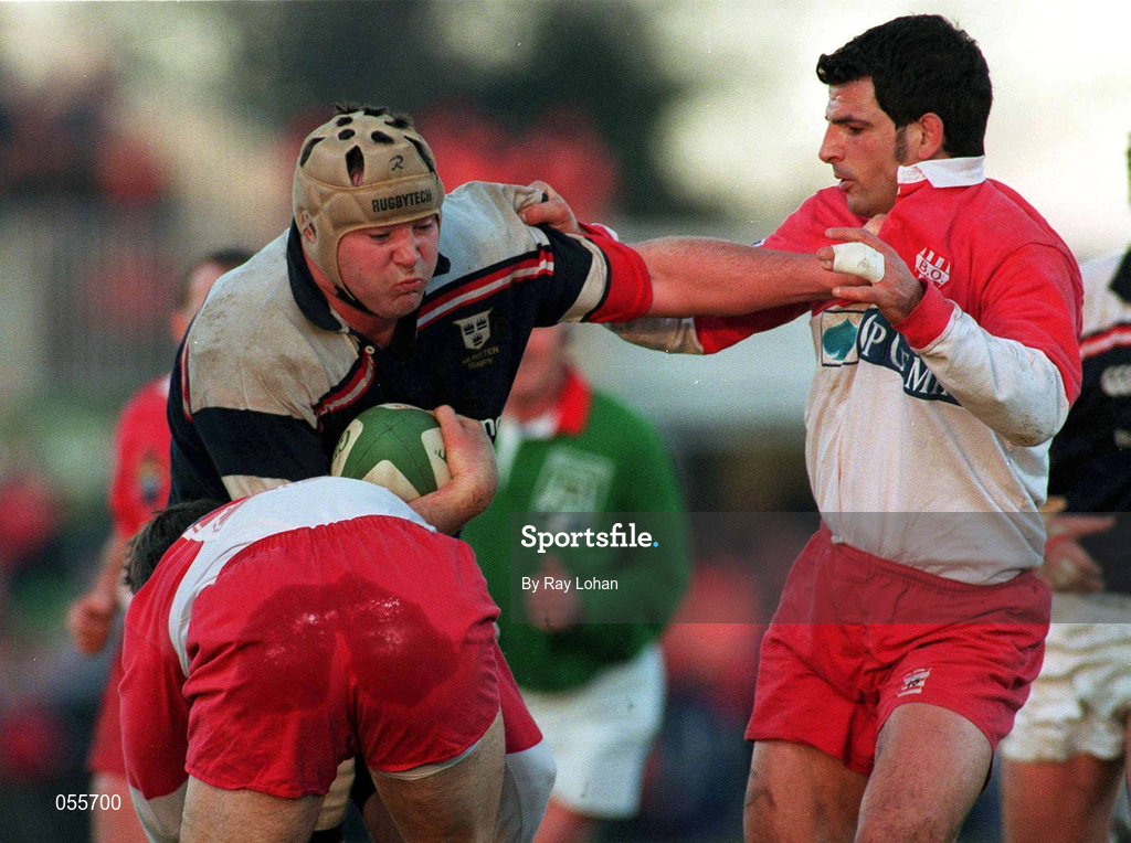 28 January 2001; Anthony Foley of Munster in action against Bernard Daguerre, left, and Marc Lievremont of Biarritz during the Heineken Cup Quarter-Final match between Munster and Biarritz at Thomond Park in Limerick. Photo by Ray Lohan/Sportsfile