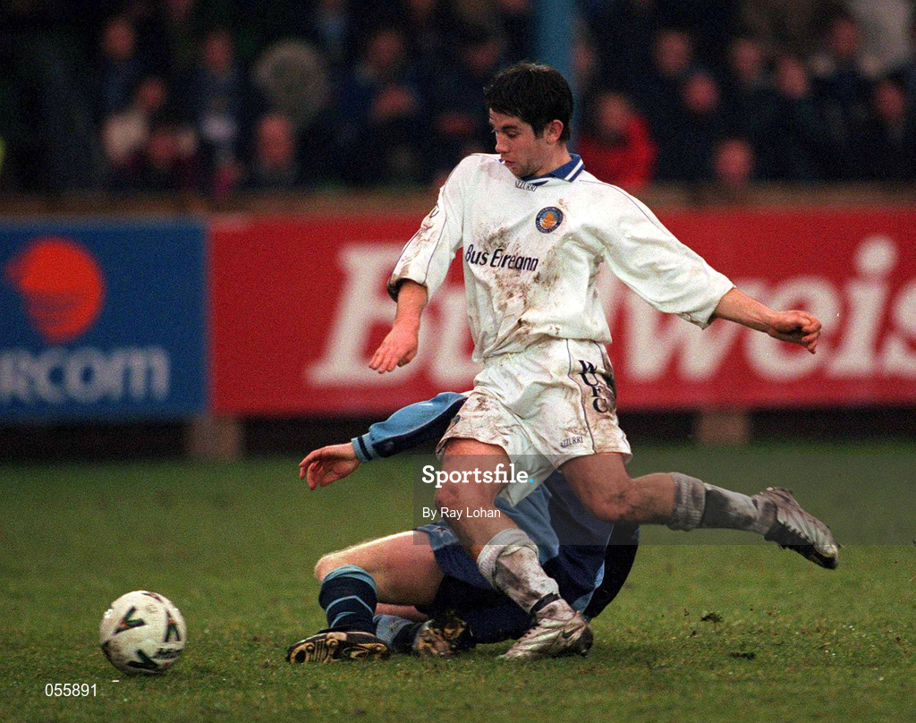 4 February 2001; David Whittle of Waterford United is tackled by Michael O'Donnell of UCD during the FAI Cup Third Round match between UCD and Waterford United at Belfield Park in Dublin. Photo by Ray Lohan/Sportsfile