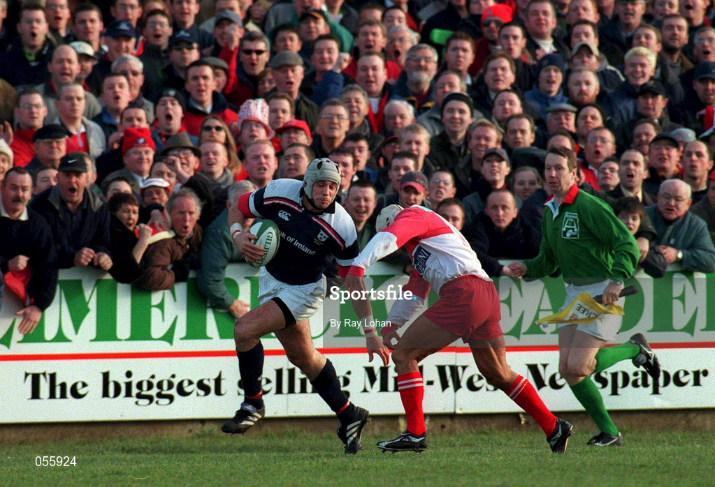 28 January 2001; Alan Quinlan of Munster is tackled by Stuart Legg of Biarritz during the Heineken Cup Quarter-Final match between Munster and Biarritz at Thomond Park in Limerick. Photo by Ray Lohan/Sportsfile