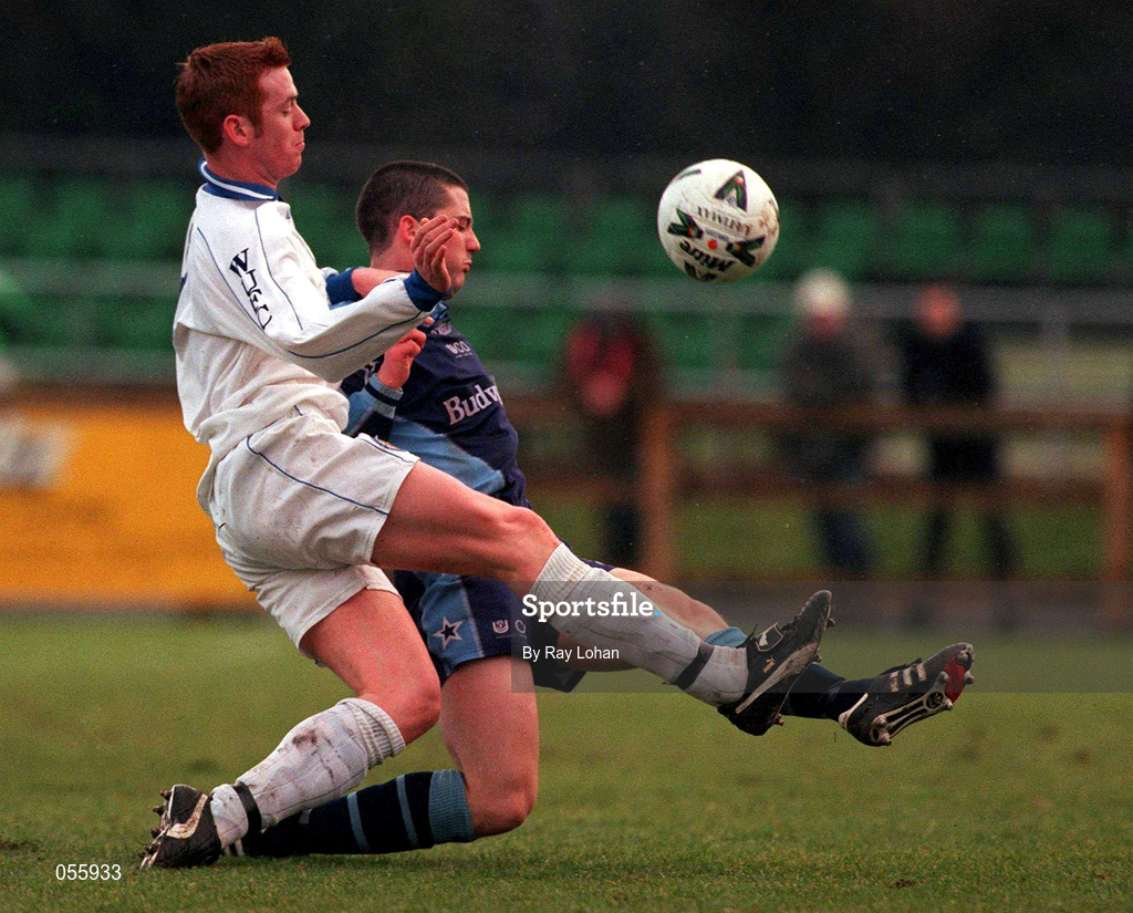 4 February 2001; Robert McAuley of UCD in action against Eric Bradley of Waterford United during the FAI Cup Third Round match between UCD and Waterford United at Belfield Park in Dublin. Photo by Ray Lohan/Sportsfile