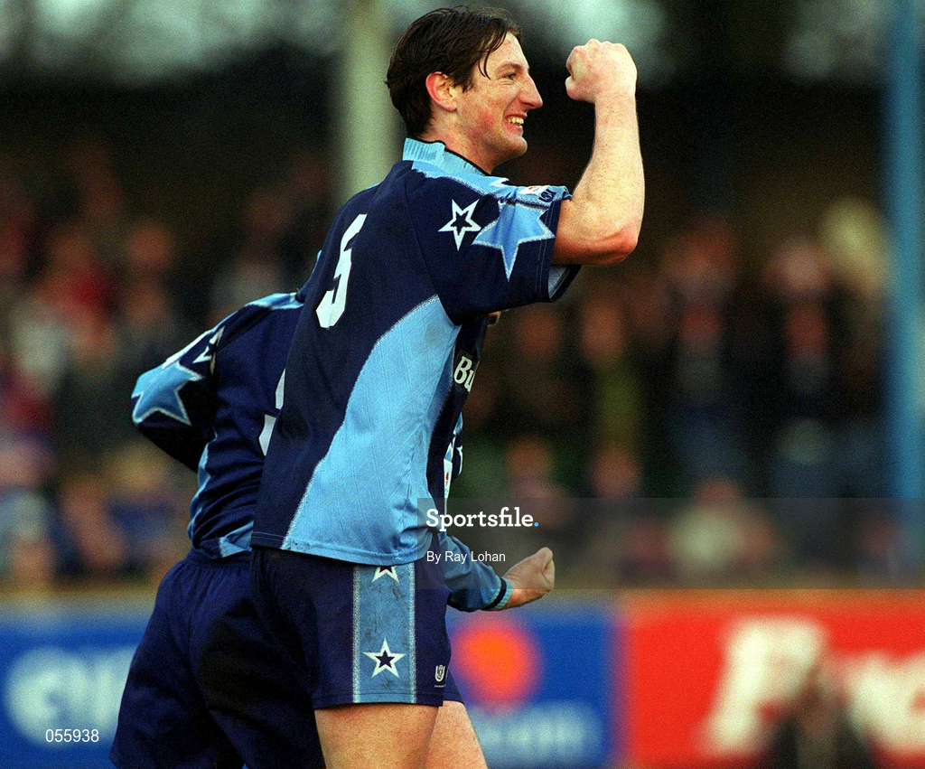 4 February 2001; Clive Delaney of UCD celbrates after team-mate Derek Swan, hidden, scored a goal during the FAI Cup Third Round match between UCD and Waterford United at Belfield Park in Dublin. Photo by Ray Lohan/Sportsfile