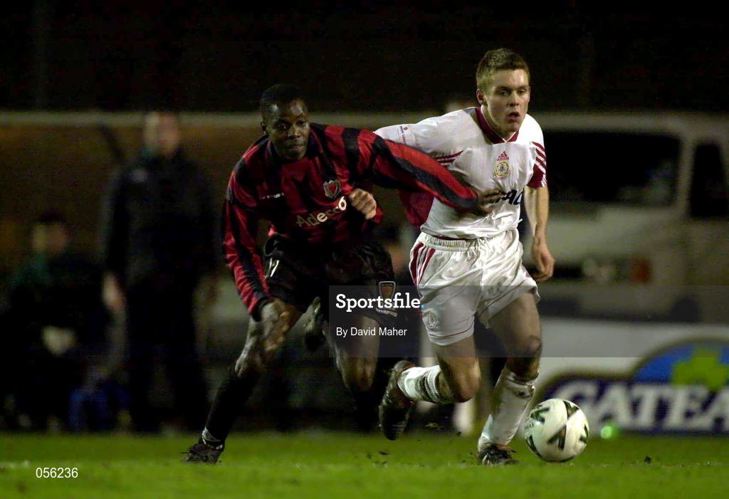 9 February 2001; Alan Murphy of Galway United in action against Mark Rutherford of Bohemians during the Eircom League Premier Division match between Bohemians and Galway United at Dalymount Park in Dublin. Photo by David Maher/Sportsfile