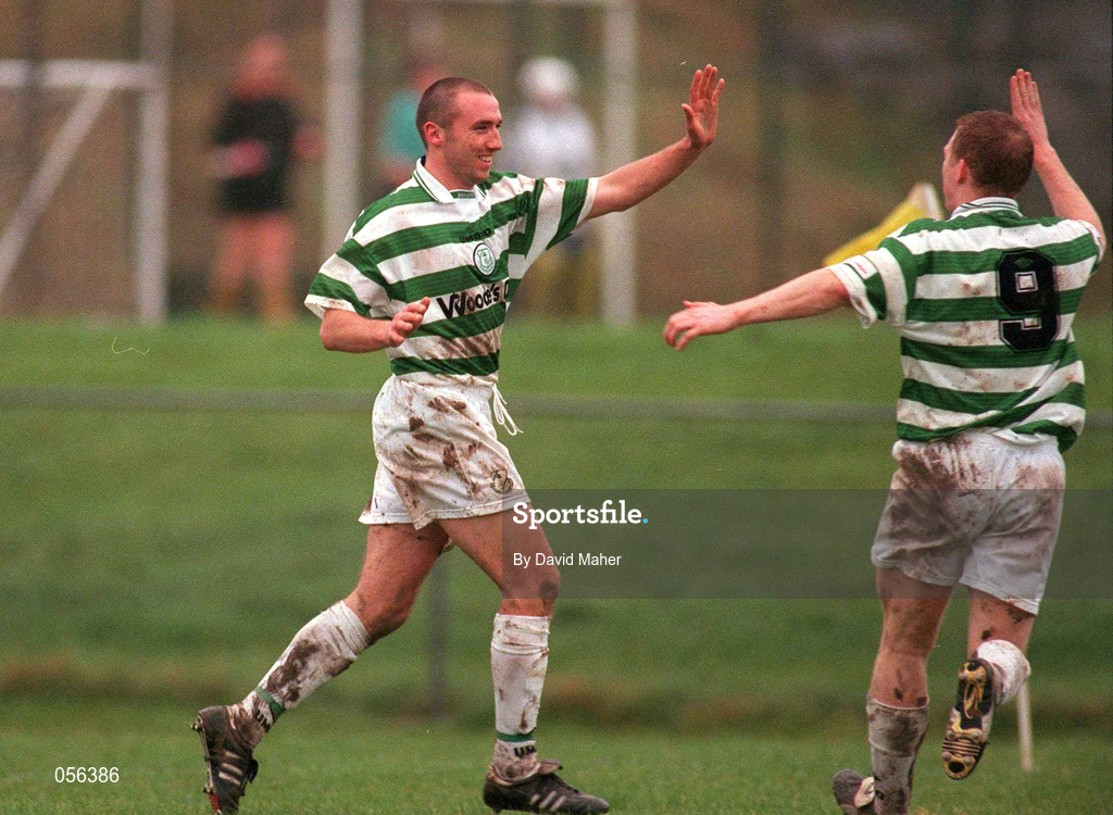 11 February 2001; Tony Grant of Shamrock Rovers, left, celebrates with team-mate Sean Francis after scoring their side's third goal during the Eircom League Premier Division match between Kilkenny City and Shamrock Rovers at Scanlan Park in Kilkenny. Photo by David Maher/Sportsfile
