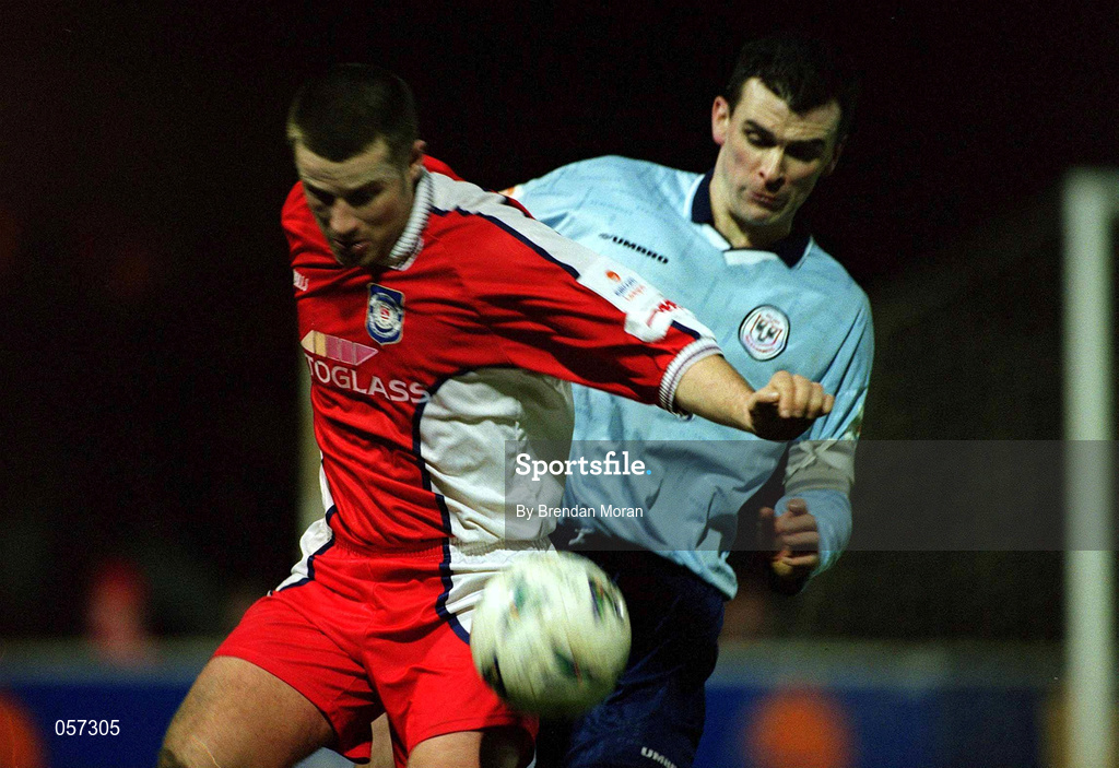 23 February 2001; Michael Holt of St Patrick's Athletic in action against Pat Scully of Shelbourne during the Eircom League Premier Division match between St Patrick's Athletic and Shelbourne at Richmond Park in Dublin. Photo by Brendan Moran/Sportsfile