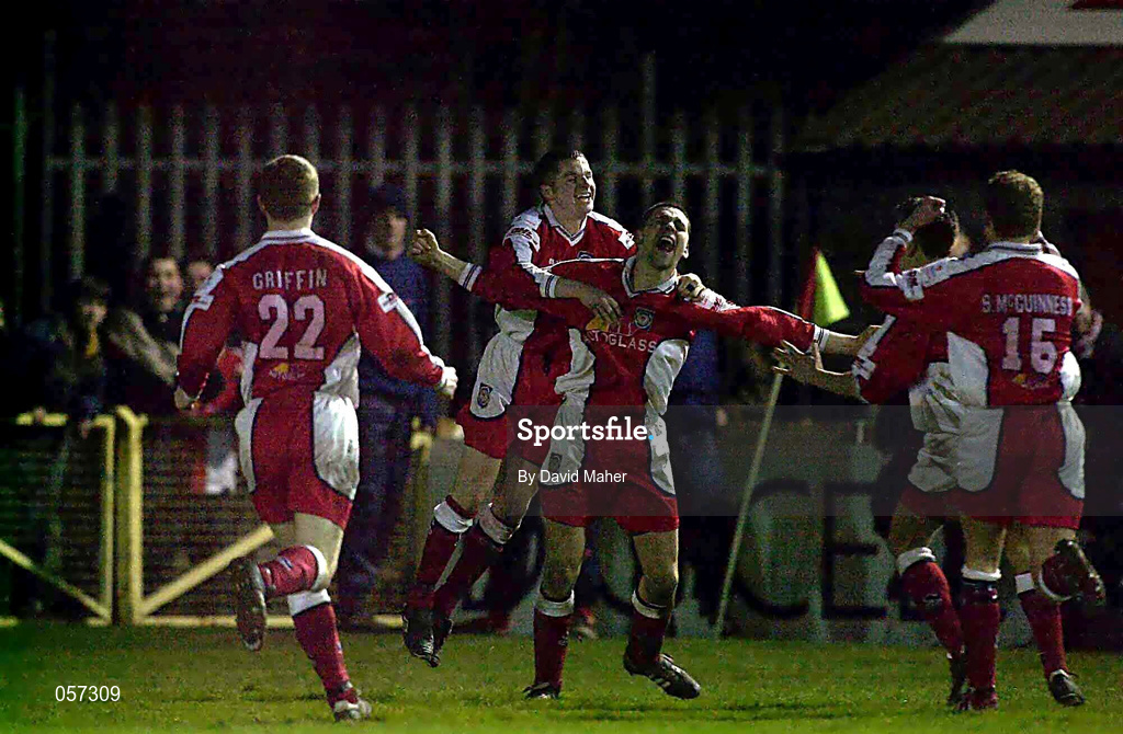 23 February 2001; Darragh Maguire, centre, celebrates with St Patrick's Athletic team-mates Robbie McGuinness, Robbie Griffin, Stephen McGuinness and Ger McCarthy after scoring their second goal during the Eircom League Premier Division match between St Patrick's Athletic and Shelbourne at Richmond Park in Dublin. Photo by David Maher/Sportsfile