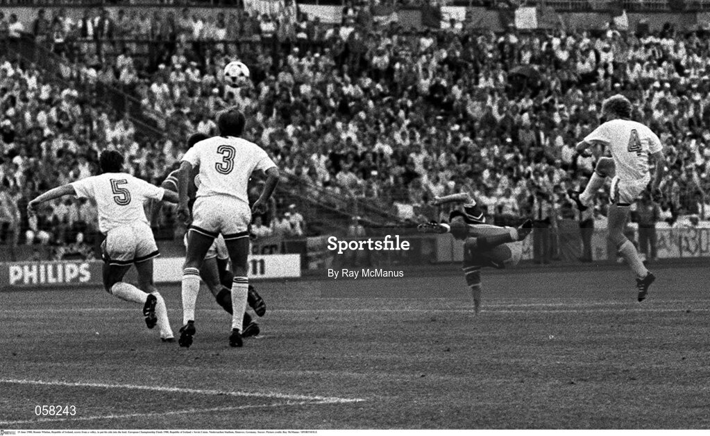 15 June 1988; Ronnie Whelan of Republic of Ireland scores his side's goal from a volley during the UEFA European Football Championship Finals Group B match between Republic of Ireland and USSR at the Niedersachen Stadium in Hanover, Germany. Photo by Ray McManus/Sportsfile