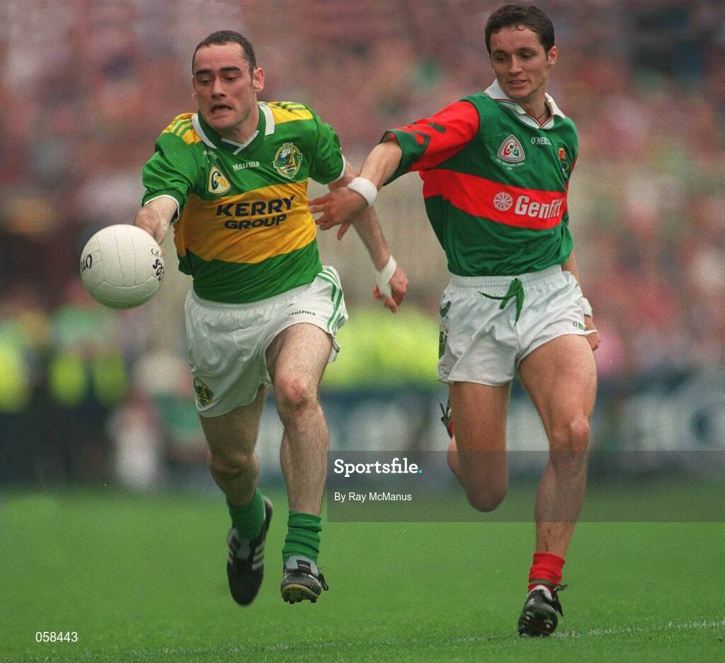28 September 1997; Pa Laide, Kerry, is tackled by Noel Connelly, Mayo. Kerry v Mayo, All Ireland Final, Croke Park, Dublin, Football. Picture credit; Ray McManus / SPORTSFILE
