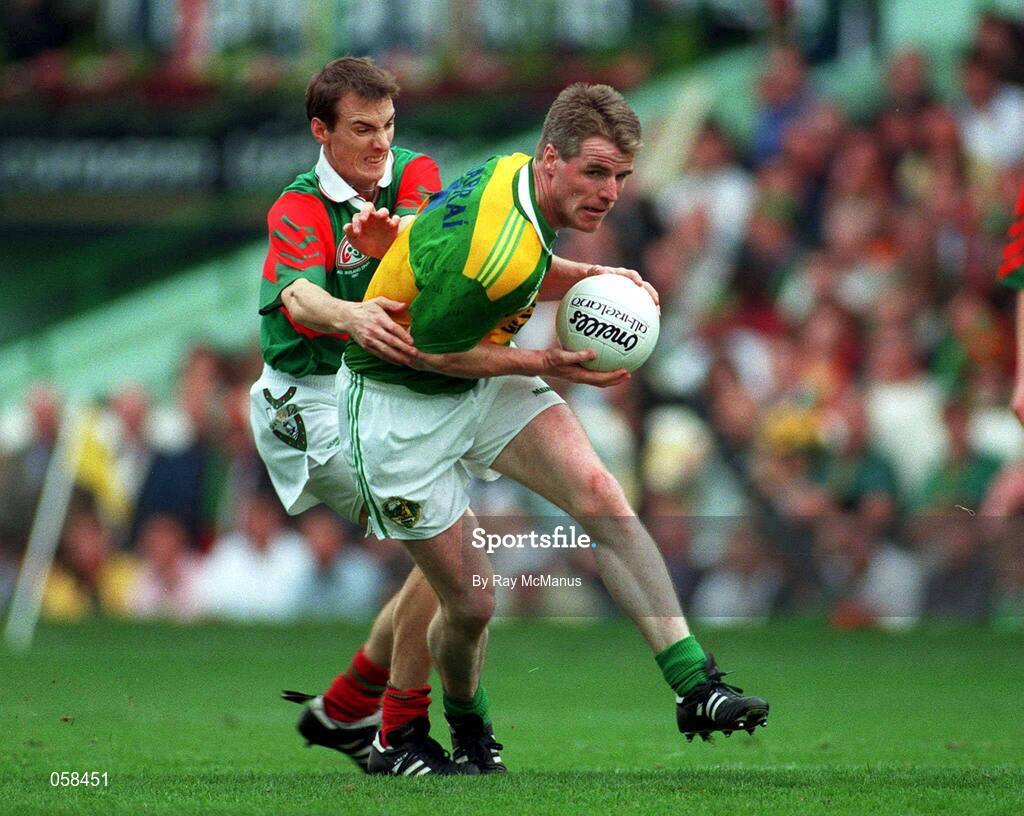 28 September 1997; Eamonn Breen, Kerry, is tackled by John Casey, Mayo. Kerry v Mayo, All Ireland Final, Croke Park, Dublin, Football. Picture credit; Ray McManus / SPORTSFILE