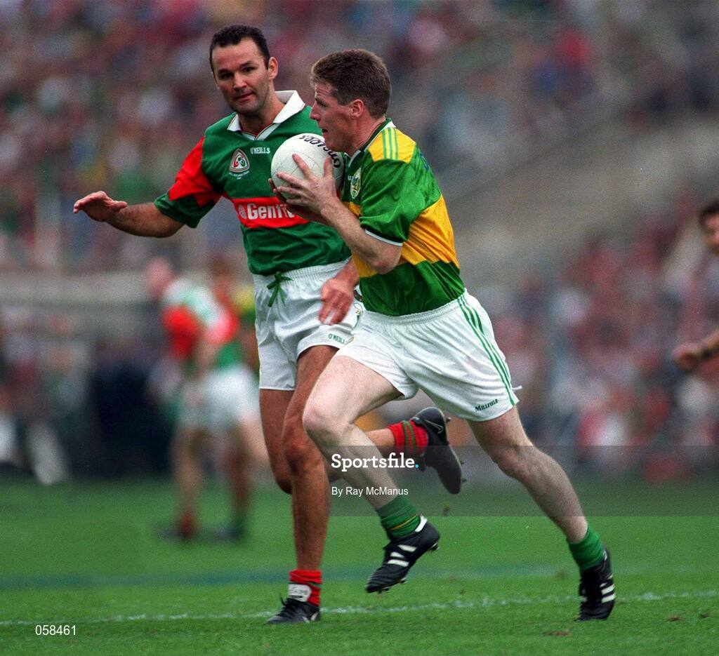 28 September 1997; Eamonn Breen, Kerry, is tackled by Liam McHale, Mayo. Kerry v Mayo, All Ireland Final, Croke Park, Dublin, Football. Picture credit; Ray McManus / SPORTSFILE