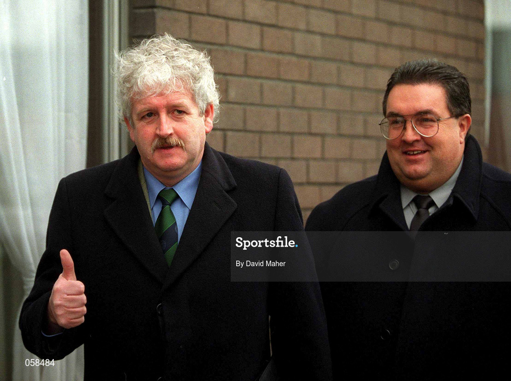 16 March 2001; Milo Corcoran, FAI Vice President and Noel Kennedy, right, the Connacht Football Association member of the FAI National Council arrive for the FAI Board of Management meeting at the Ashling Hotel in Dublin. Photo by David Maher/Sportsfile