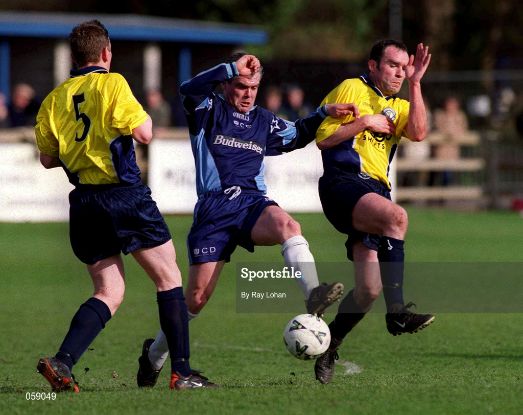 1 April 2001; Derek Swan of UCD in action against Shane Bradley, left, and Trevor Scanlon of Finn Harps during the Eircom League Premier Division match between UCD and Finn Harps at Belfield in UCD, Dublin. Photo by Ray Lohan/Sportsfile