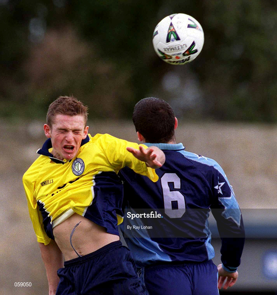 1 April 2001; Kevin McHugh of Finn Harps in action against Robert McAuley of UCD during the Eircom League Premier Division match between UCD and Finn Harps at Belfield in UCD, Dublin. Photo by Ray Lohan/Sportsfile