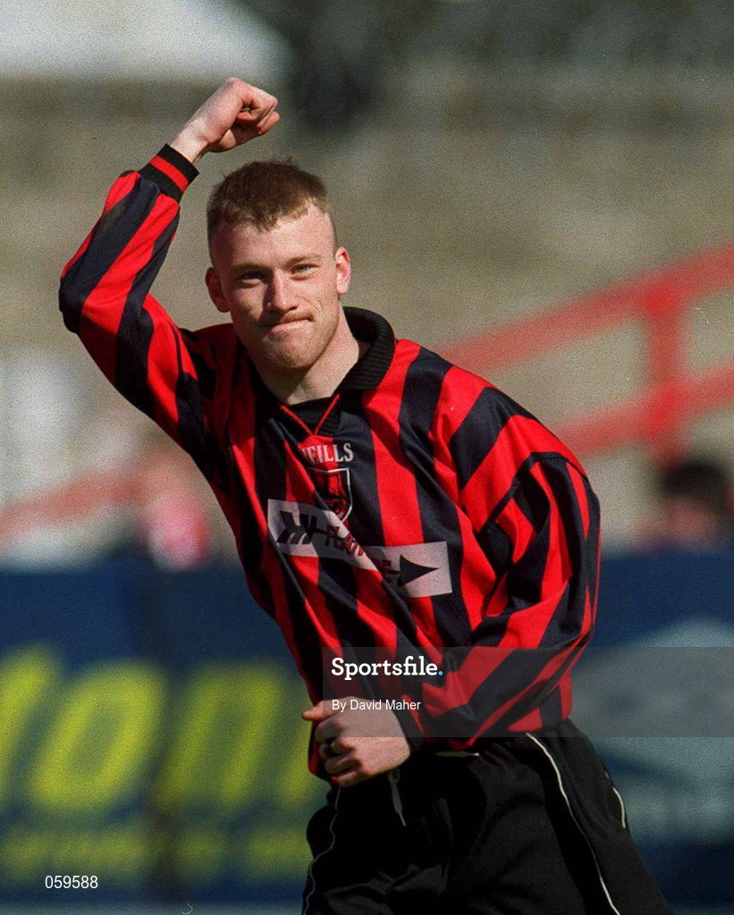 15 April 2001; Keith O'Connor of Longford Town celebrates scoring his side's first goal during the FAI Harp Lager Cup Quarter-Final match between Portmarnock and Longford Town at Tolka Park in Dublin. Photo by David Maher/Sportsfile