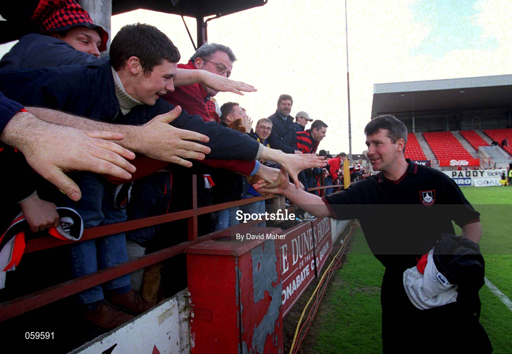 15 April 2001; Longford Town manager Stephen Kenny celebrates with supporters after the FAI Harp Lager Cup Quarter-Final match between Portmarnock and Longford Town at Tolka Park in Dublin. Photo by David Maher/Sportsfile