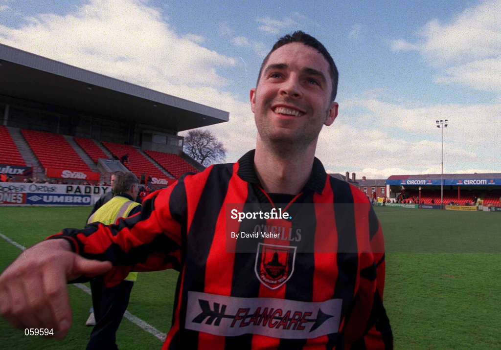15 April 2001; Paul McNally of Longford Town, who scored the winning goal, celebrates after the FAI Harp Lager Cup Quarter-Final match between Portmarnock and Longford Town at Tolka Park in Dublin. Photo by David Maher/Sportsfile