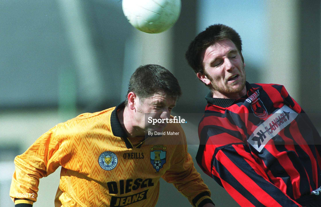 15 April 2001; Stuart Byrne of Longford Town in action against Keith Bruen of Portmarnock during the FAI Harp Lager Cup Quarter-Final match between Portmarnock and Longford Town at Tolka Park in Dublin. Photo by David Maher/Sportsfile