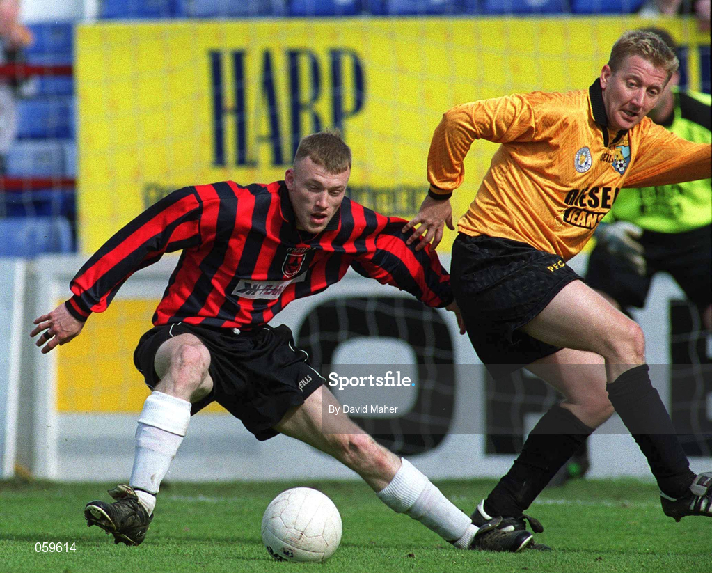 15 April 2001; Keith O'Connor of Longford Town in action against Dave Mooney of Portmarnock during the FAI Harp Lager Cup Quarter-Final match between Portmarnock and Longford Town at Tolka Park in Dublin. Photo by David Maher/Sportsfile