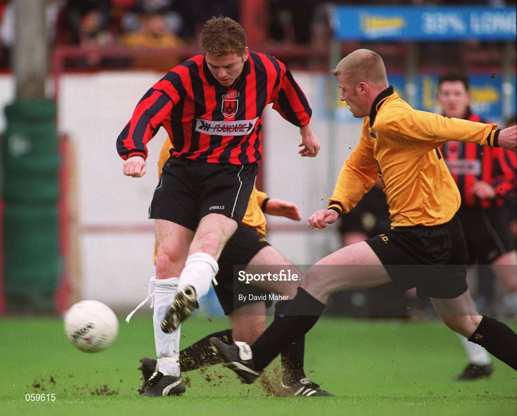 15 April 2001; Eric Smith of Longford Town in action against John Gibbons of Portmarnock during the FAI Harp Lager Cup Quarter-Final match between Portmarnock and Longford Town at Tolka Park in Dublin. Photo by David Maher/Sportsfile