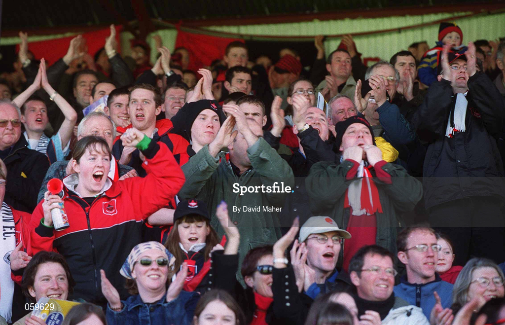 15 April 2001; Longford Town supporters cheers on their team during the FAI Harp Lager Cup Quarter-Final match between Portmarnock and Longford Town at Tolka Park in Dublin. Photo by David Maher/Sportsfile