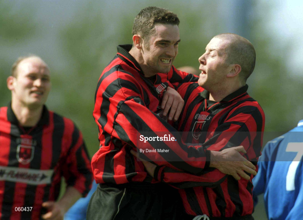 22 April 2001; Paul McNally Longford Town, centre, celebrates with team-mate Vinny Perth, after scoring his side's equalising goal from the penalty spot during the Harp Lager FAI Cup Semi-Final match between Waterford United and Longford Town at the RSC in Waterford. Photo by David Maher/Sportsfile