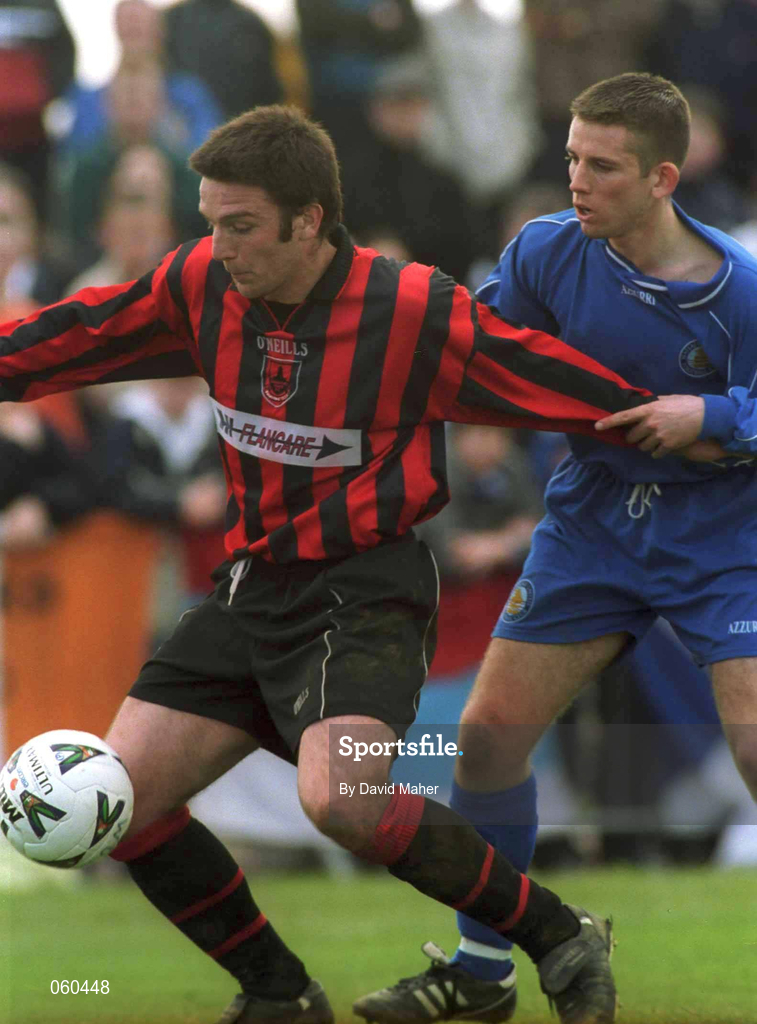 22 April 2001; Stuart Byrne of Longford Town in action against Kevin Whittle of Waterford United during the Harp Lager FAI Cup Semi-Final match between Waterford United and Longford Town at the RSC in Waterford. Photo by David Maher/Sportsfile