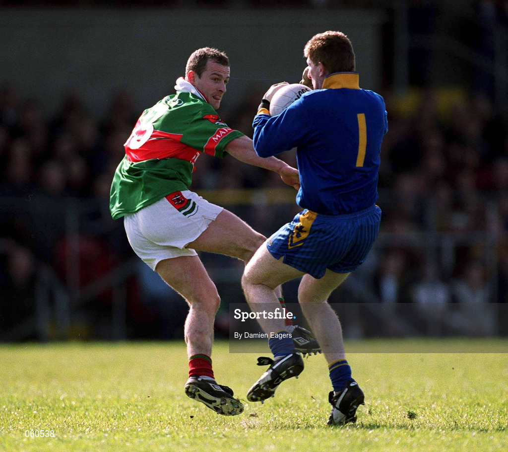 22 April 2001; Roscommon goalkeeper Shane Curran is tackled by Marty McNicholas of Mayo during the Allianz National Football League Semi Final match between Mayo and Roscommon at Markievicz Park in Sligo. Photo by Damien Eagers/Sportsfile