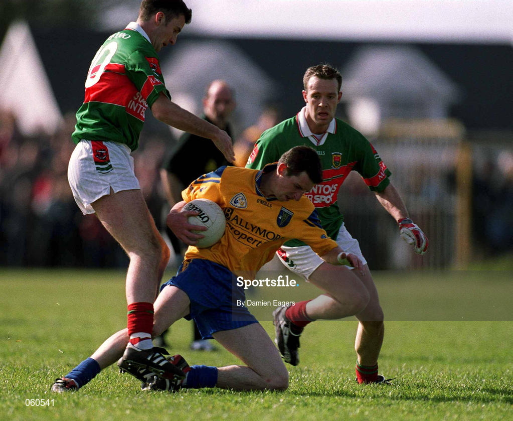 22 April 2001; John Whyte of Roscommon is tackled by Maurice Sheridan, left, and David Brady of Mayo during the Allianz National Football League Semi Final match between Mayo and Roscommon at Markievicz Park in Sligo. Photo by Damien Eagers/Sportsfile
