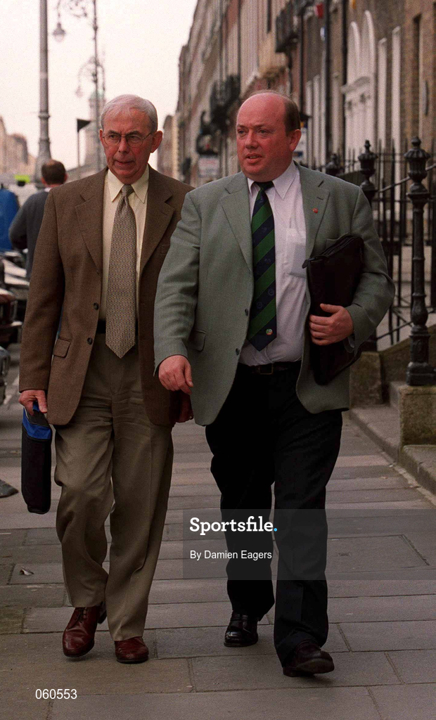 23 April 2001; John Byrne of Galway United right, and Charles Cahill, FAI Honorary Vice President, arrive for the FAI Board of Management meeting at the FAI Offices in Merrion Square, Dublin. Photo by Damien Eagers/Sportsfile