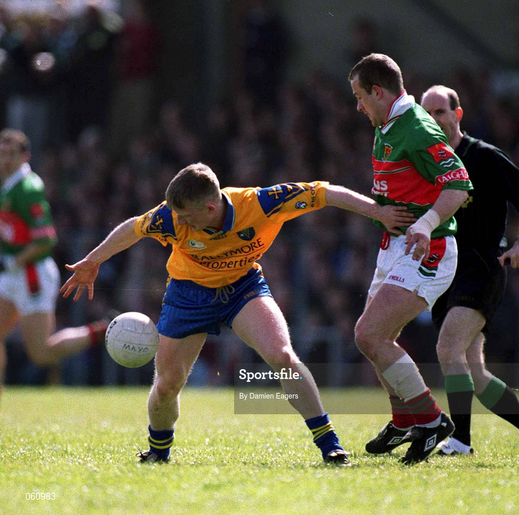 22 April 2001; Ian Daly of Roscommon in action against Trevor Mortimer of Mayo during the Allianz National Football League Semi Final match between Mayo and Roscommon at Markievicz Park in Sligo. Photo by Damien Eagers/Sportsfile