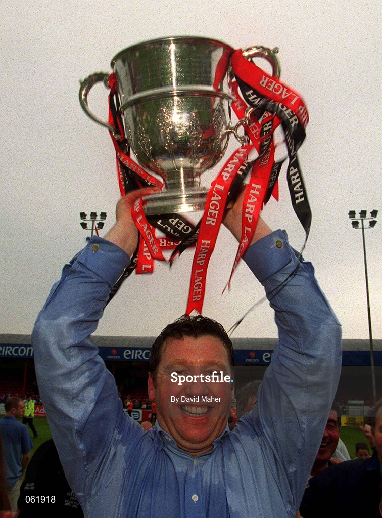 13 May 2001; Bohemians manager Roddy Collins lifts the cup after the Harp Lager FAI Cup Final match between Bohemians and Longford Town at Tolka Park in Dublin. Photo by David Maher/Sportsfile