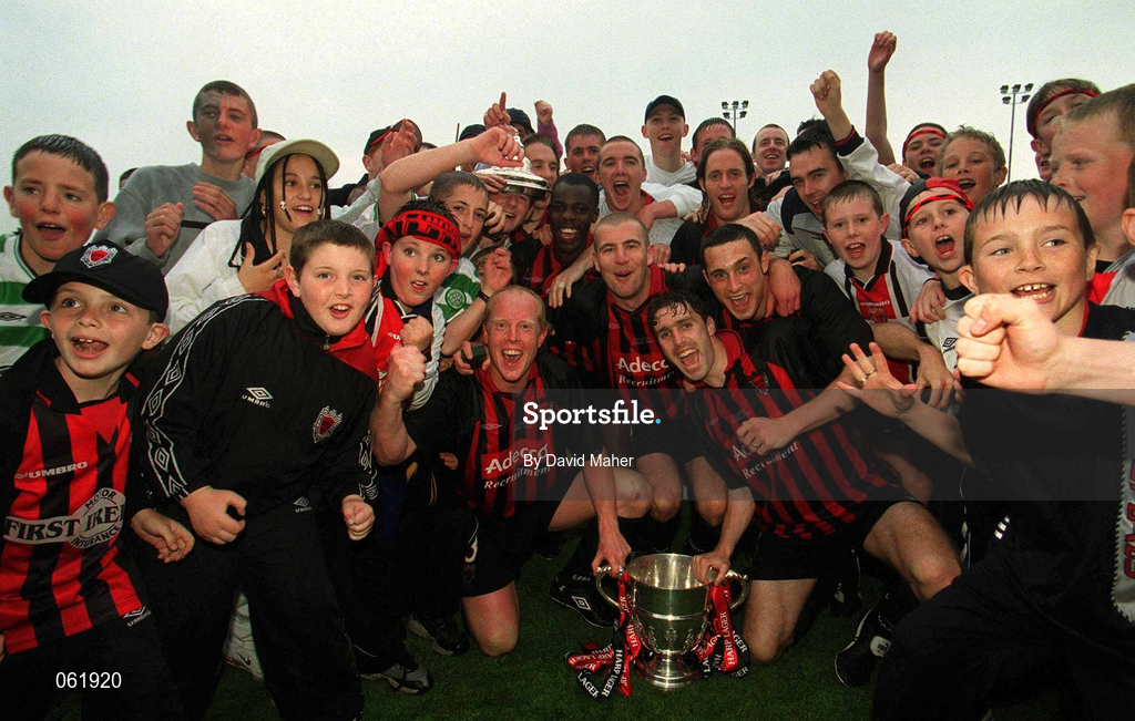 13 May 2001; Bohemians players and supporters celebrate with the cup after the Harp Lager FAI Cup Final match between Bohemians and Longford Town at Tolka Park in Dublin. Photo by David Maher/Sportsfile