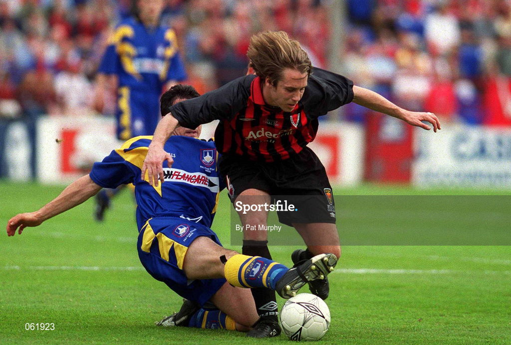 13 May 2001; Kevin Hunt of Bohemians in action against Stephen Kelly of Longford Town during the Harp Lager FAI Cup Final match between Bohemians and Longford Town at Tolka Park in Dublin. Photo by Pat Murphy/Sportsfile