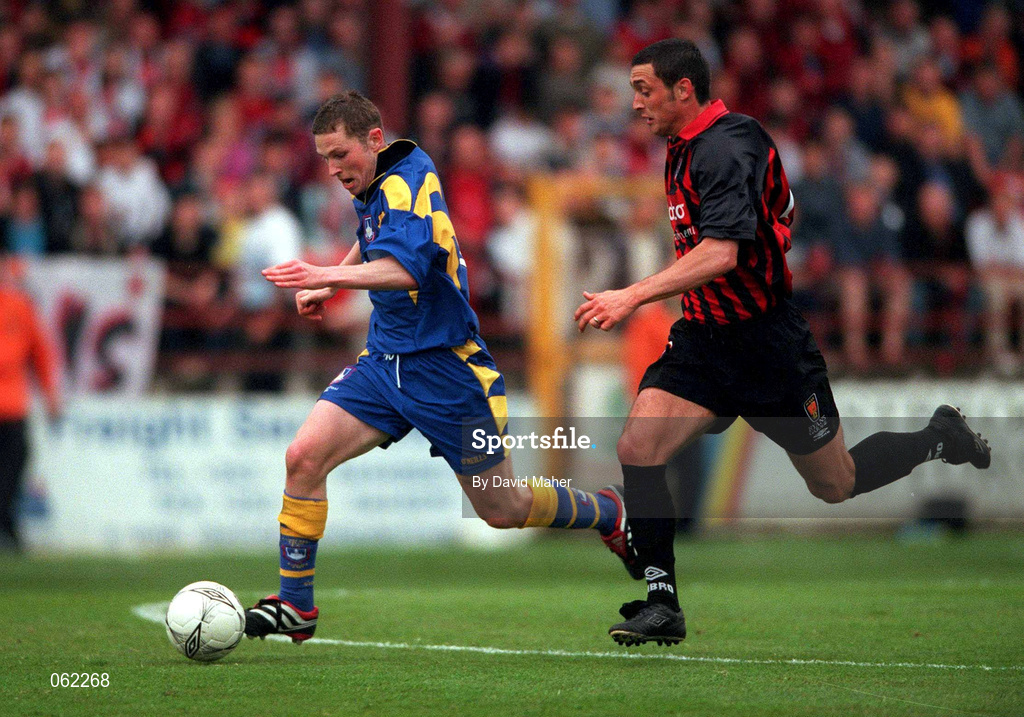 13 May 2001; Sean Prunty of Longford Town in action against Dave Morrison of Bohemians during the Harp Lager FAI Cup Final match between Bohemians and Longford Town at Tolka Park in Dublin. Photo by David Maher/Sportsfile