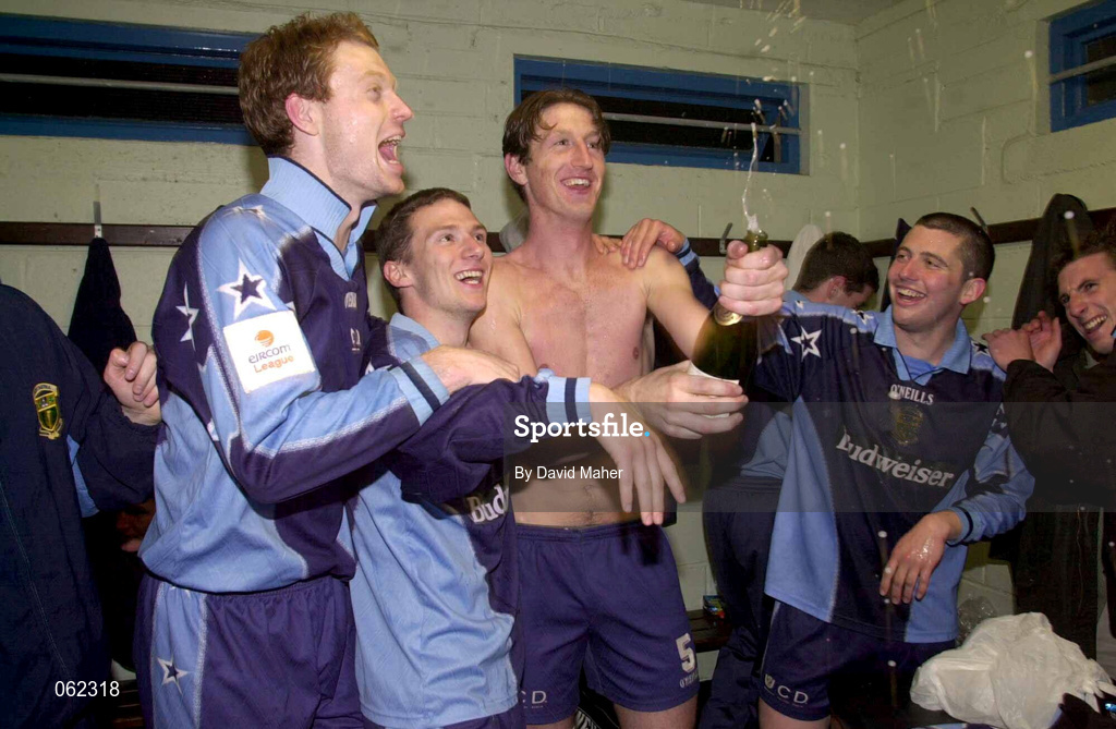 18 May 2001; UCD players left to right, Tony McDonnell, Paul O'Mara, Clive Delaney and Robert McAuley celebrate in their dressing room after victory over Athlone Town's during the penalty shootout in the National League Relegation / Promotion Playoff 2nd Leg match between UCD and Athlone Town at Belfield Park in Dublin. Photo by David Maher/Sportsfile