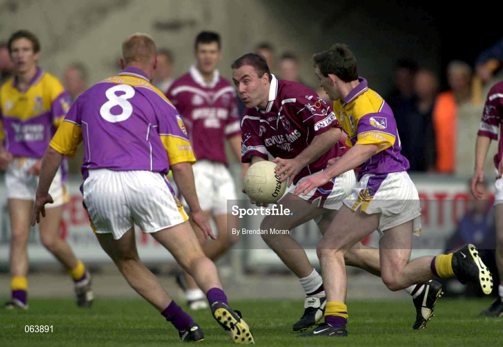 9 June 2001; Ger Heavin of Westmeath in action against Colm Morris and Willie Carley, 8, of Wexford during the Bank of Ireland All-Ireland Senior Football Championship Qualifier Round 1 match between Wexford and Westmeath at Wexford Park in Wexford. Photo by Brendan Moran/Sportsfile