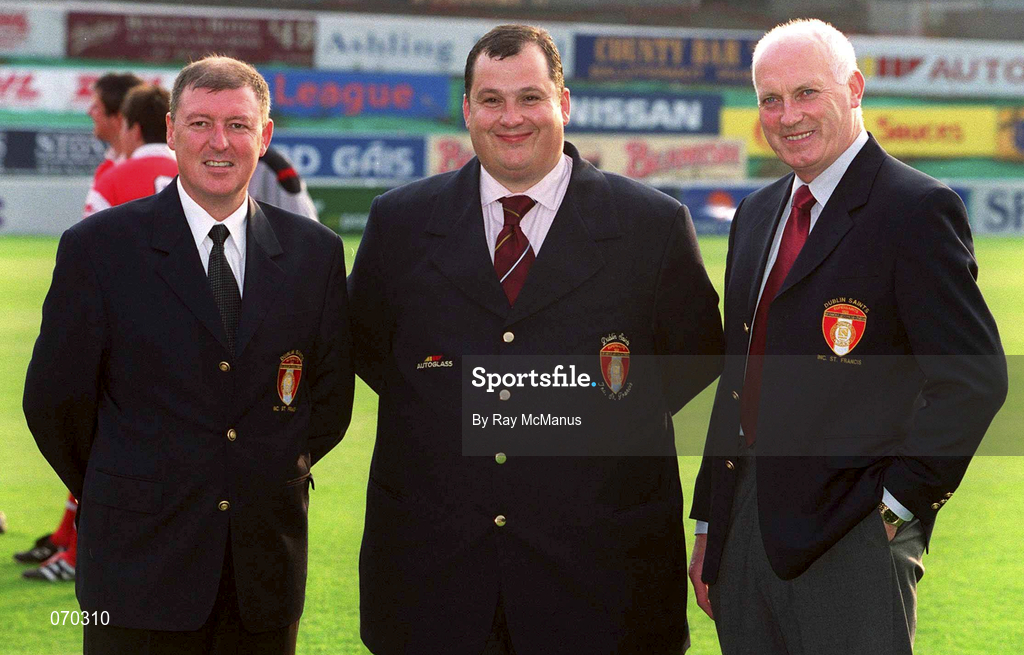 13 August 2001; Manager Pat Dolan, centre, with Sean Foley and Alan Duncan during a St Patrick's Athletic, incorporating St Francis, Squad Portrait session at Richmond Park in Dublin. Photo by Ray McManus/Sportsfile