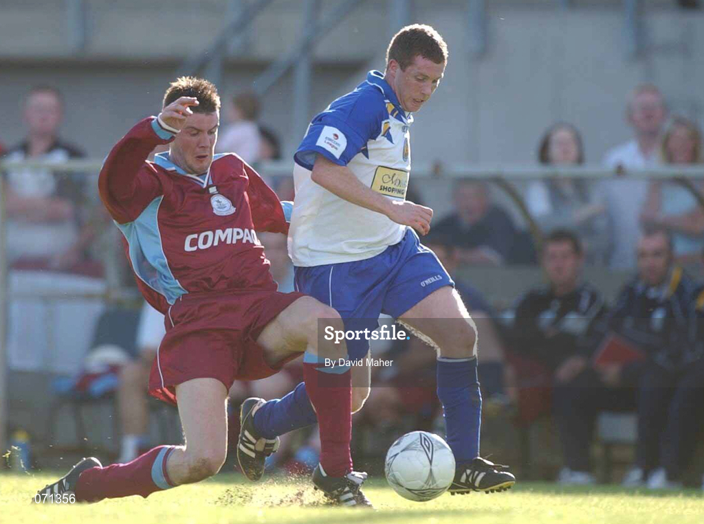 26 August 2001; Ken Lundy of Monaghan United in action against Tom Silke of Galway United during the eircom League Premier Division match between Monaghan United and Galway United at Century Homes Park in Monaghan. Photo by David Maher/Sportsfile