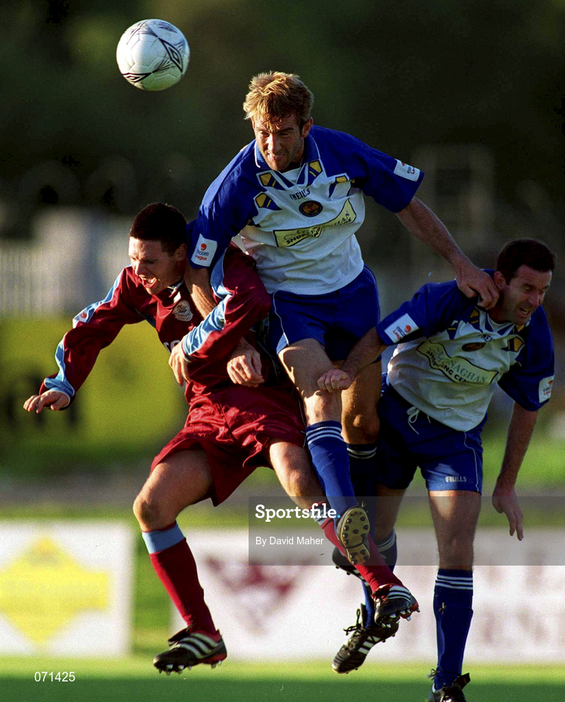 26 August 2001; Brendan Place and Brian Mooney of Monaghan United in action against Galway United's Adrian Carbury during the eircom League Premier Division match between Monaghan United and Galway United at Century Homes Park in Monaghan. Photo by David Maher/Sportsfile