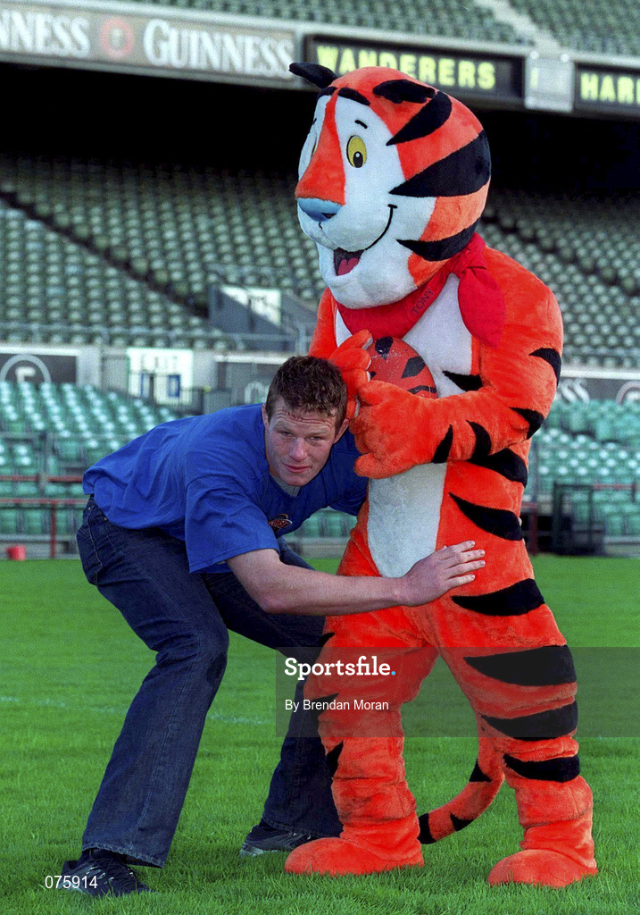 31 October 2001; The Irish Rugby Football Union and Kellogg's Frosties have teamed up to launch Frosties Youth Development Programme, a new and exciting partnership aimed at introducing new recruits to the game. The project imbraces the involvement of 76 employed Youth Development Officers liasing with a potential 430 schools around Ireland in a 26 week programme, from Sept to Easter, with the aim of introducing to the game of rugby, schoolchildren from the age group of under 8's to 15 years. Pictured at the launch are Leinster and Ireland second row Malcolm O'Kelly tackling Tony the Tiger. Photo by Brendan Moran/Sportsfile