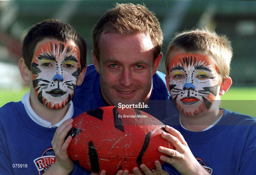 31 October 2001; The Irish Rugby Football Union and Kellogg's Frosties have teamed up to launch Frosties Youth Development Programme, a new and exciting partnership aimed at introducing new recruits to the game. The project imbraces the involvement of 76 employed Youth Development Officers liasing with a potential 430 schools around Ireland in a 26 week programme, from Sept to Easter, with the aim of introducing to the game of rugby, schoolchildren from the age group of under 8's to 15 years. Pictured at the launch are Leinster and Ireland wing Denis Hickie, with Kevin Beirne and Jonathan Totterdell. Photo by Brendan Moran/Sportsfile