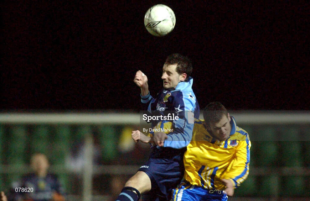 18 December 2001; Daragh Ryan of UCD in action against Ged Leonard of Drogheda United during the FAI Carlsberg Cup Second Round Replay match between UCD and Drogheda United at Belfield Park in Dublin. Photo by David Maher/Sportsfile