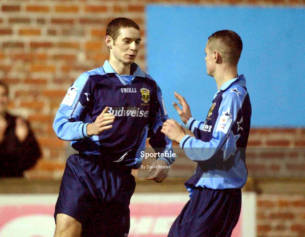 18 December 2001; Alan McNally of UCD, celebrates after scoring his side's first goal with team-mate Robert Martin during the FAI Carlsberg Cup Second Round Replay match between UCD and Drogheda United at Belfield Park in Dublin. Photo by David Maher/Sportsfile