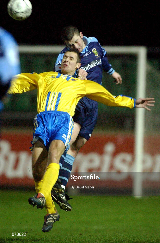 18 December 2001; Declan O'Brien of Drogheda United in action against Robert McAuley of UCD during the FAI Carlsberg Cup Second Round Replay match between UCD and Drogheda United at Belfield Park in Dublin. Photo by David Maher/Sportsfile