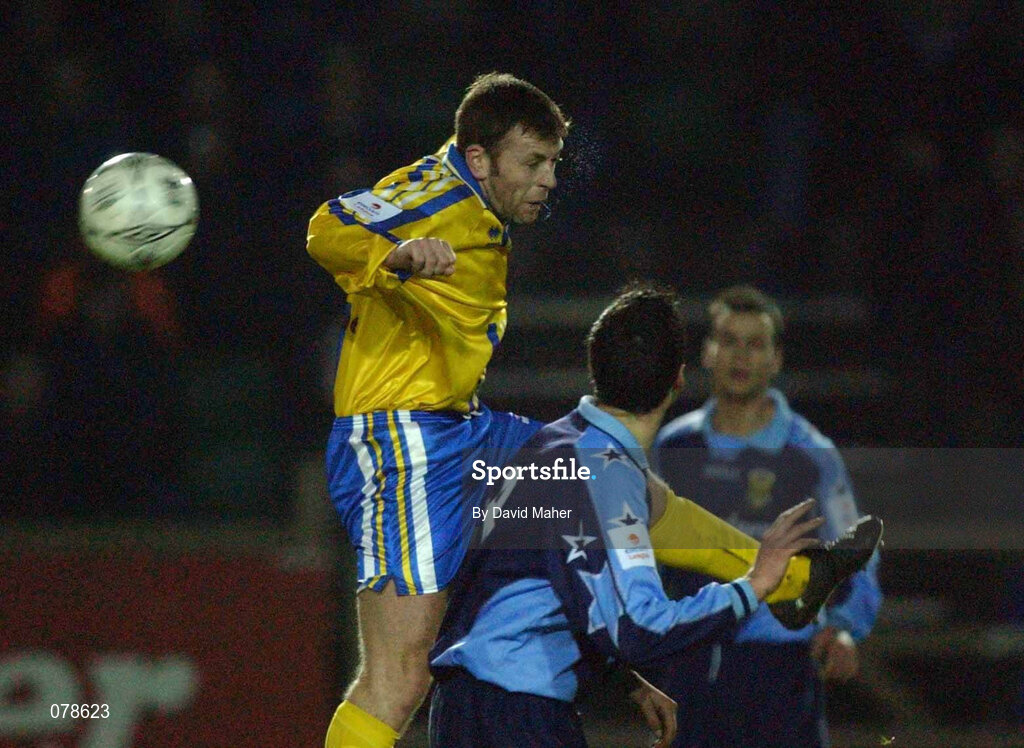 18 December 2001; Don Trienay of Drogheda United in action against Ciaran Martyn of UCD during the FAI Carlsberg Cup Second Round Replay match between UCD and Drogheda United at Belfield Park in Dublin. Photo by David Maher/Sportsfile