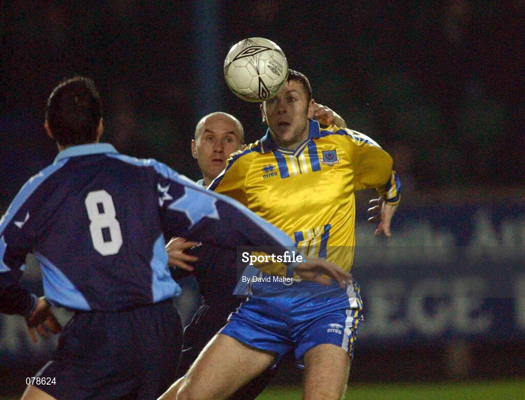 18 December 2001; Don Trienay of Drogheda United in action against Paul Doolin and Ciaran Martyn of UCD during the FAI Carlsberg Cup Second Round Replay match between UCD and Drogheda United at Belfield Park in Dublin. Photo by David Maher/Sportsfile