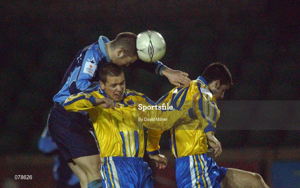 18 December 2001; Robert McAuley of UCD in action against Declan O'Brien and Danny O'Connor of Drogheda United during the FAI Carlsberg Cup Second Round Replay match between UCD and Drogheda United at Belfield Park in Dublin. Photo by David Maher/Sportsfile