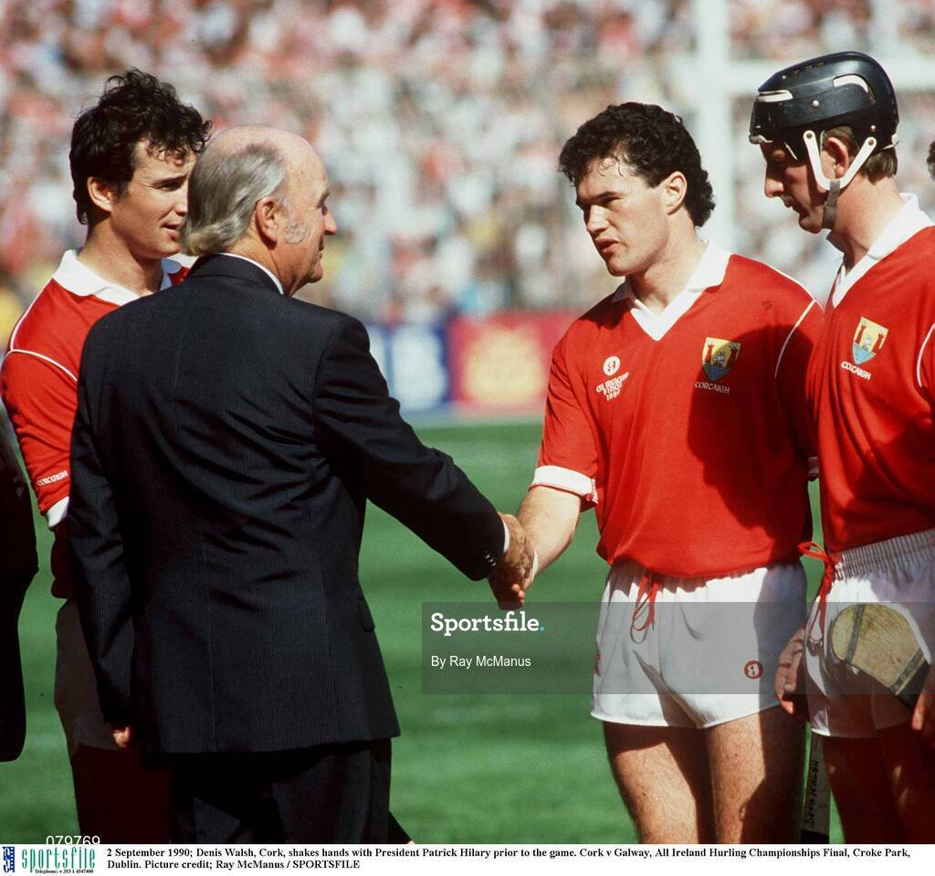 2 September 1990; Denis Walsh, Cork, shakes hands with President Patrick Hillery prior to the game. Cork v Galway, All Ireland Hurling Championships Final, Croke Park, Dublin. Picture credit: Ray McManus / SPORTSFILE