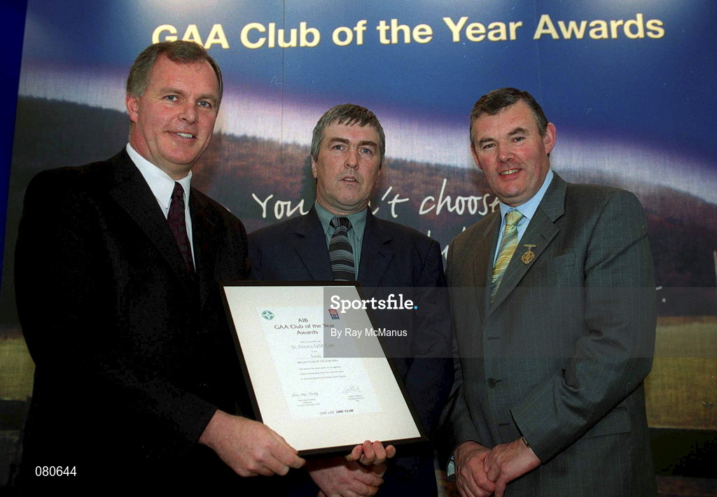 4 February 2002; Pictured at the AIB GAA Club of the Year Awards 2001 in Croke Park are Eugene Sheehy, Managing Director AIB, President of the GAA Sean McCague, Pat Sydes of St. Fintan's GAA Club who won the Laois Club of the Year Award at Croke Park in Dublin. Photo by Ray McManus/Sportsfile